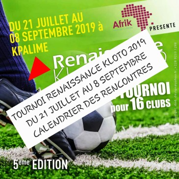 Le grand Kloto vit depuis le 21 Juillet au rythme des matches du tournoi Renaissance Kloto 5è édition (RK 2019). Après la première et deuxième journée disputées le 21 et le 28 Juillet passés, l’heure est à la remise à jour du calendrier. Ainsi ce Mercredi 31 Juillet les dernières formations qui n’ont pas encore … Lire la suite TOURNOI RK 2019: LA COMPÉTITION SE POURSUIT DEMAIN